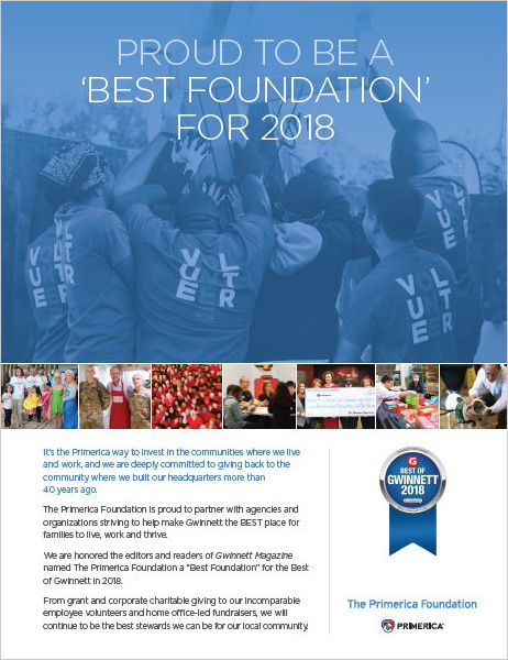 Consistently Awarded Best Foundation and Best Employer by Readers of Gwinnett Magazine:The Primerica Foundation has been named a Best Foundation in Gwinnett Magazine’s annual Best of Gwinnett community poll for three in a row (2017-2019). Primerica has been named in the same publication as a Best Employer from 2014-2019.